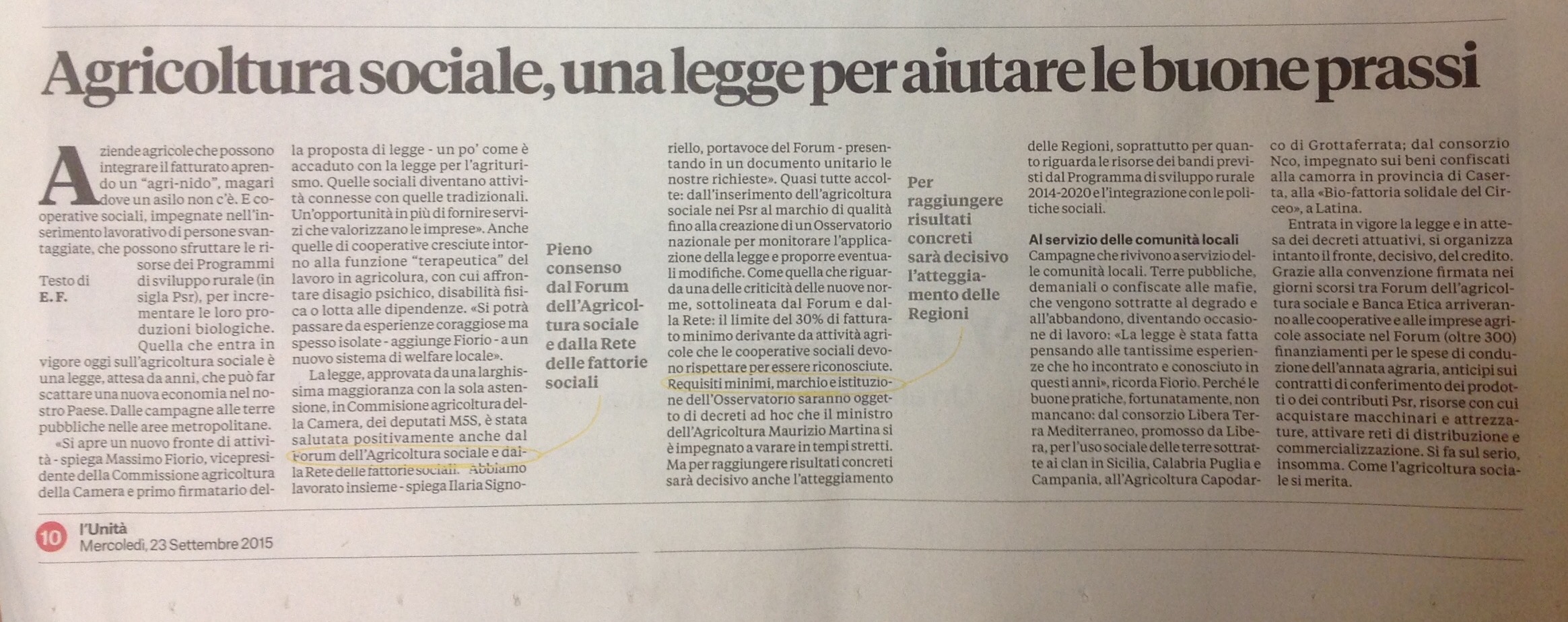 - F.F., Agricoltura sociale, una legge per aiutare le buone prassi, L’Unità 22 settembre 2015
